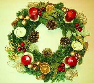 La couronne de l’avent est fabriquée à partir de branches fraîches de sapin, de houx et de pin. Elle est entourée par un ruban, des pommes de pins ou des bougies.