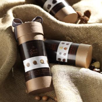 Magnifique Tube en papier Kraft ancien garni de 125gr de fruits rouges enrobés d’un assortiment de 3 chocolats ( noir, blanc, lait).